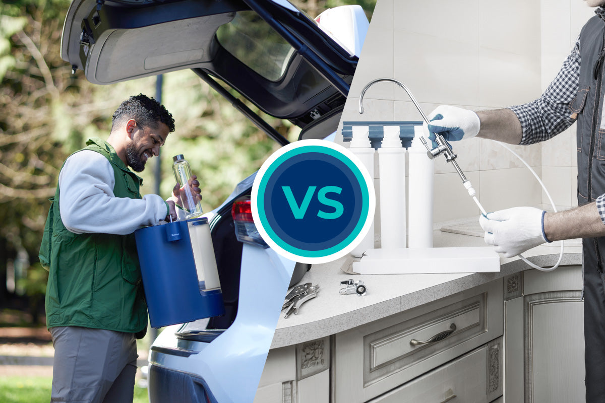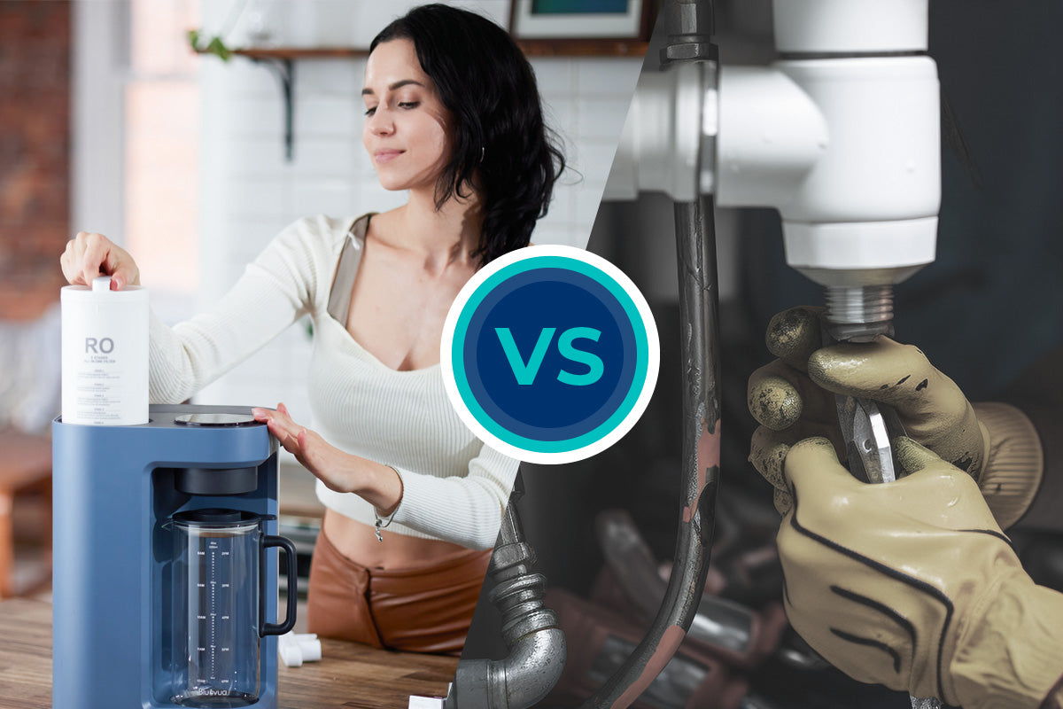Unsere kompakten Umkehrosmosesysteme passen perfekt auf jede Arbeitsplatte, sparen Platz und sind leichter zu transportieren. Ob Sie von Raum zu Raum, von Wohnung zu Wohnung oder auf Reisen gehen, genießen Sie überall den Komfort von frischem Wasser ohne sperrige Untertischsysteme.