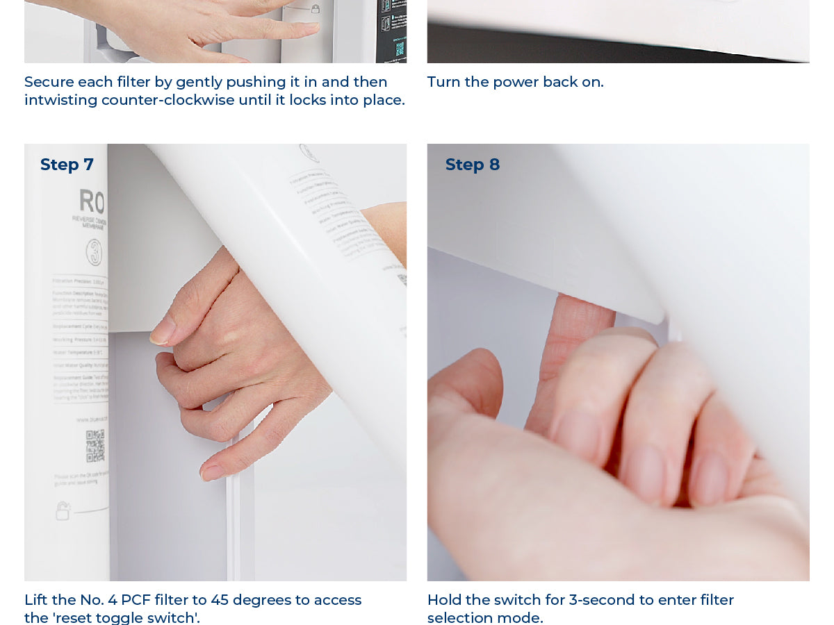 Nach dem Ersetzen der Filter werden die Lebensdaueranzeigen nicht automatisch auf voll zurückgesetzt und müssen manuell zurückgesetzt werden. Um Sie durch diesen Vorgang zu führen, folgen Sie bitte den detaillierten Schritten von Schritt X bis Schritt X auf der obigen Seite oder lesen Sie die Bedienungsanleitung .