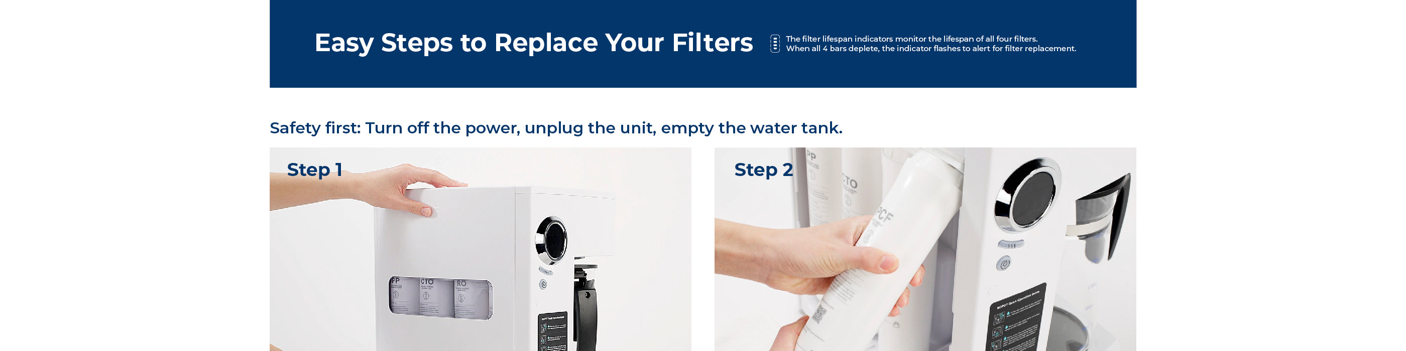 Die PP-, CTO- und PCF-Filter halten normalerweise 12 Monate oder 2000 Liter/538 Gallonen, während der RO-Filter 24 Monate oder 4000 Liter/1076 Gallonen hält. Das Anzeigefeld bietet Echtzeit-Updates zur Filterlebensdauer. Wenn alle Balken leer sind, blinken die entsprechenden Filtersymbole und signalisieren so den Austausch. Wir empfehlen, bei Balken „1“ einen Ersatzfilter zu kaufen und ihn bei Balken „0“ auszutauschen.